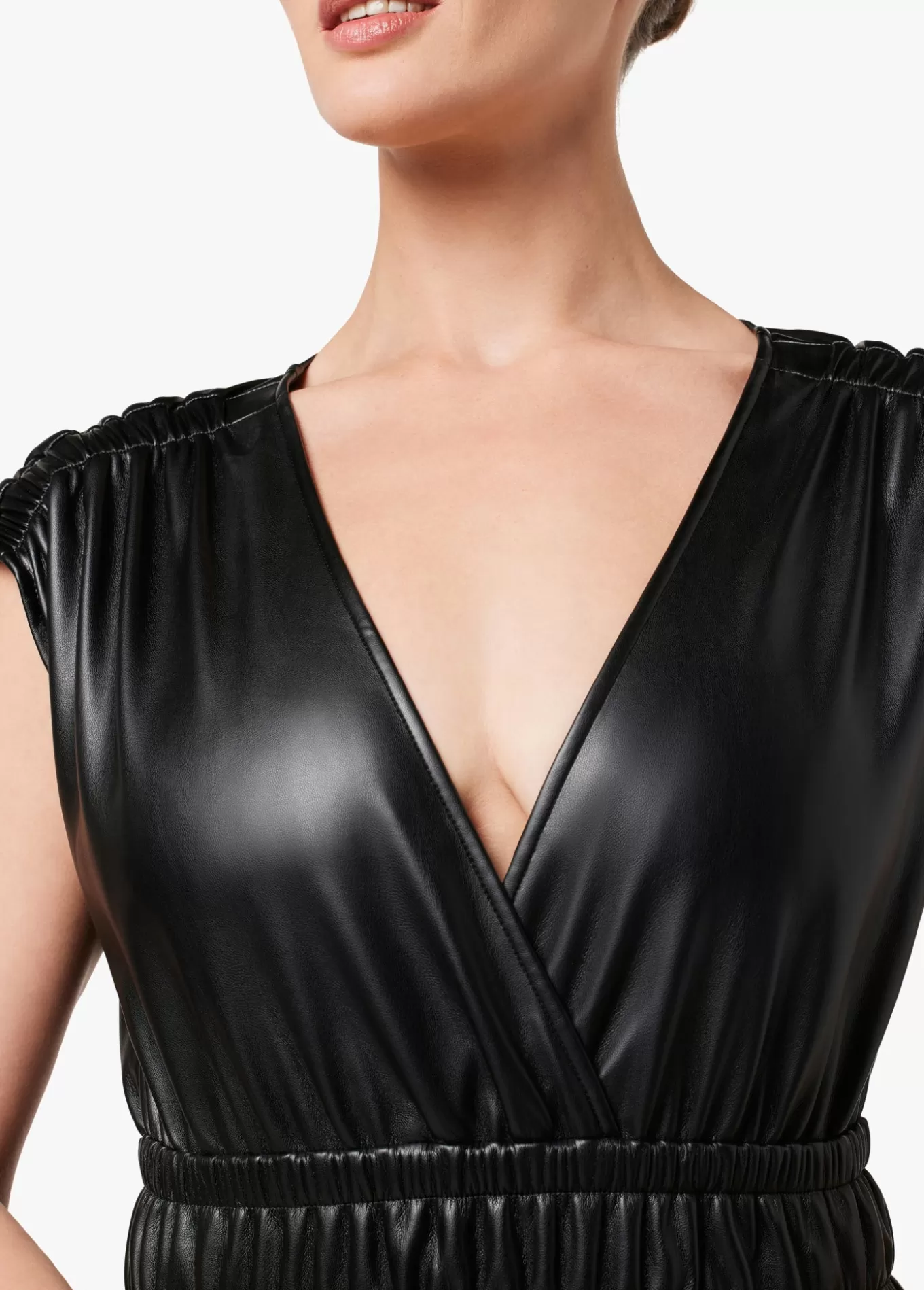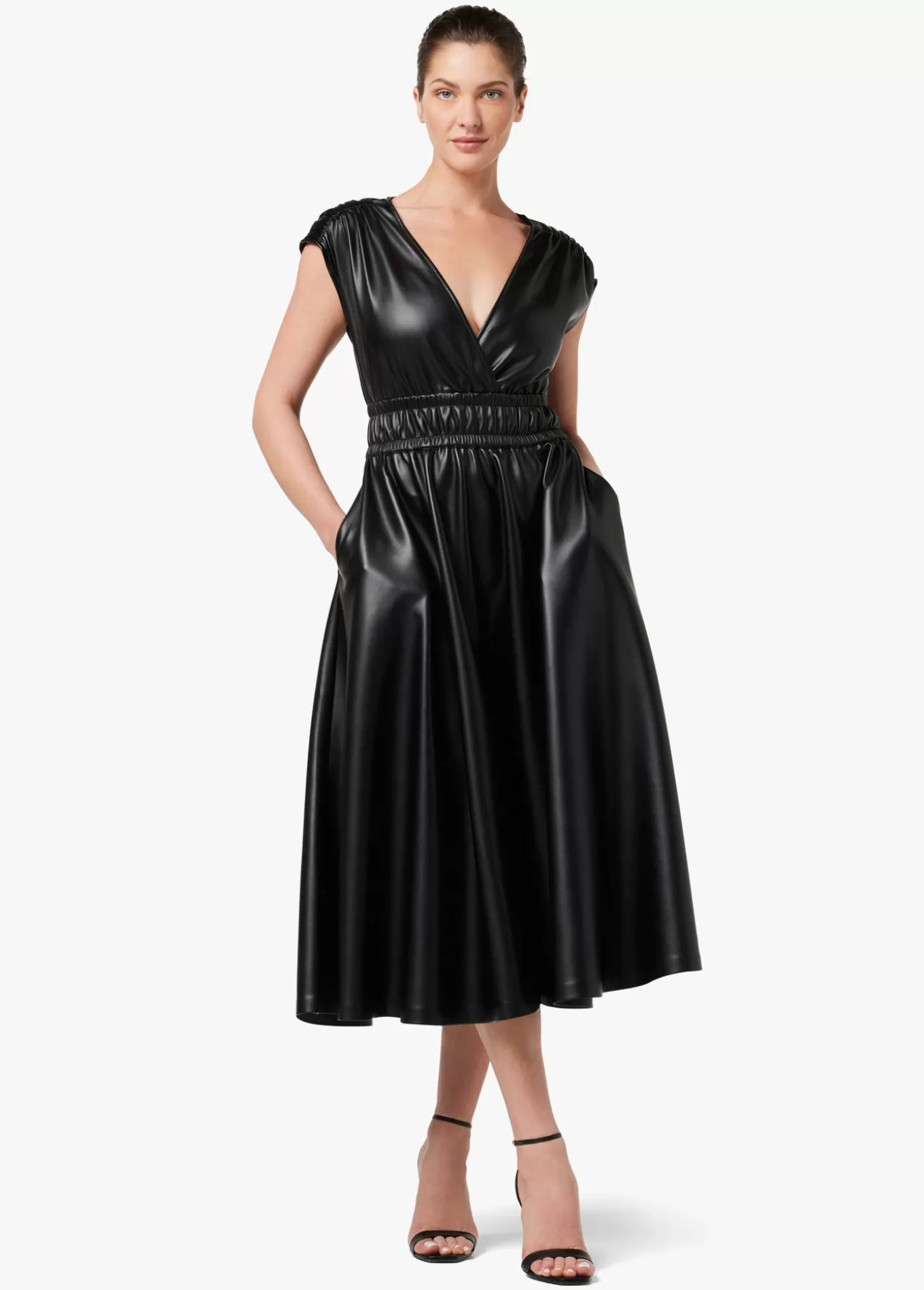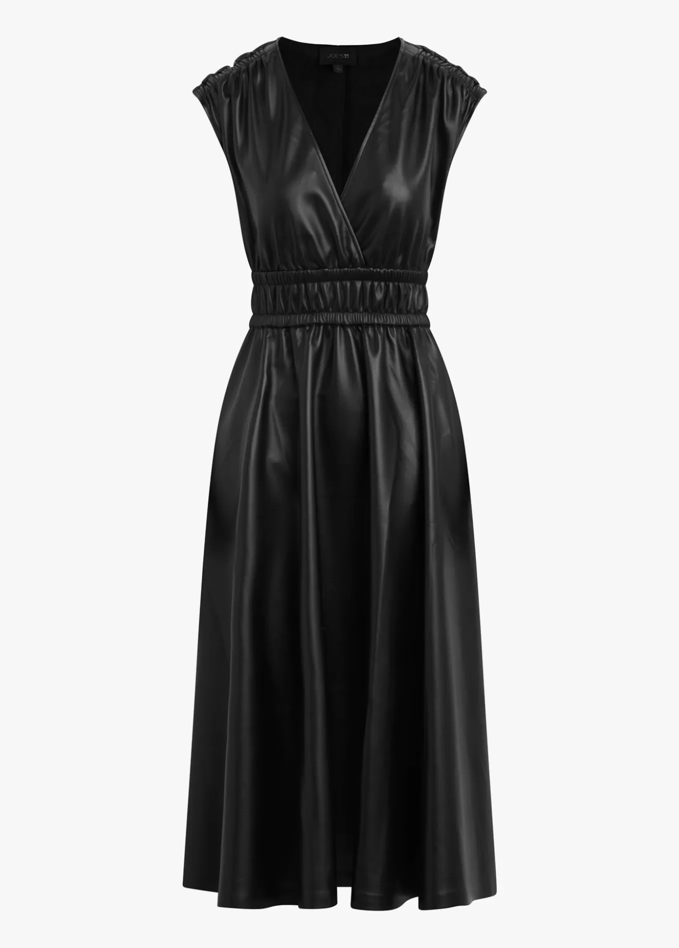 Cut from luxe vegan leather, the Felicity Dress puts a modern spin on a timeless midi style. Detailing at the shoulder, a surplice front and a flattering gathered skirt give this sleeveless dress the most flattering silhouette. Plus, it has side seam pockets.100% VEGAN LEATHERMODEL IS WEARING SIZE S