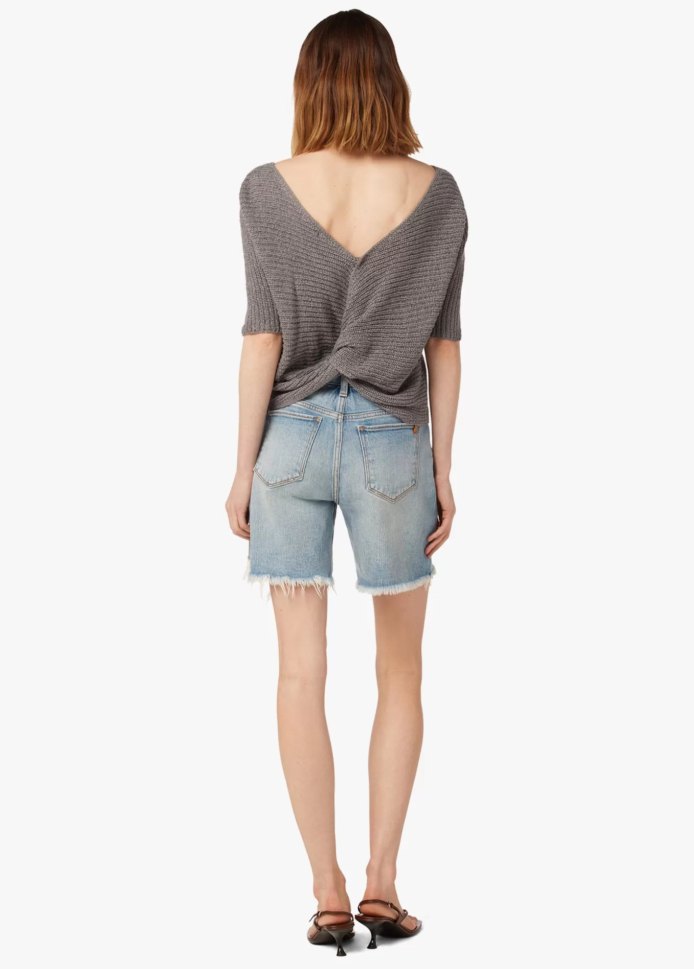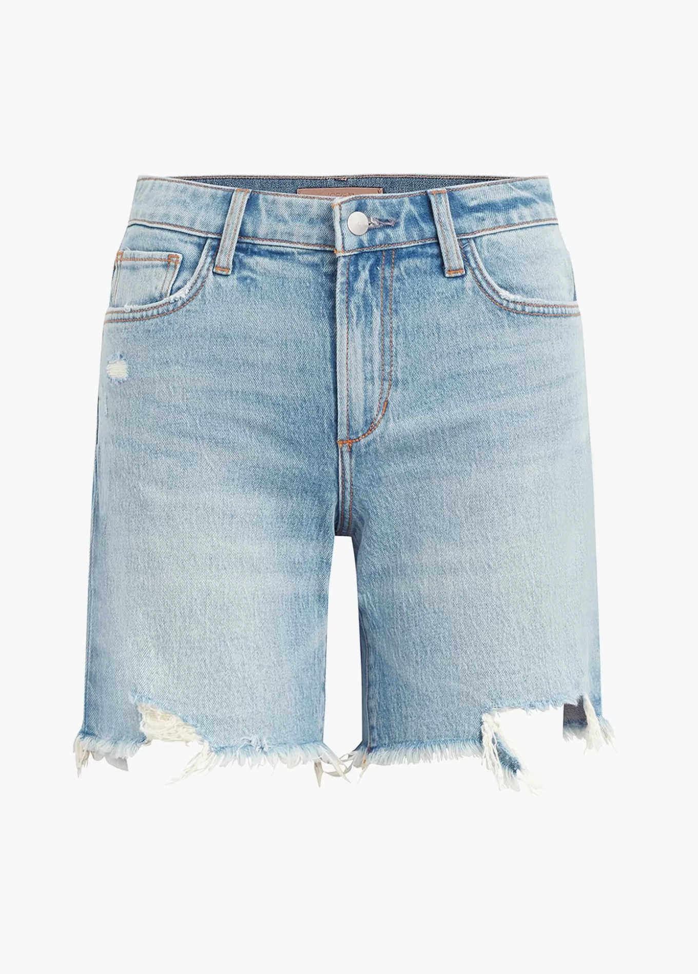 The 7; Lara Bermuda Short in 'Brightside Destruct' is the perfect pair for warm, sunny days. Made with just enough of a comfortable stretch, this five-pocket style features a slightly longer length and torn hems. The vintage character of the workwear hue has a casual finish so these Bermudas look like you’ve worn them