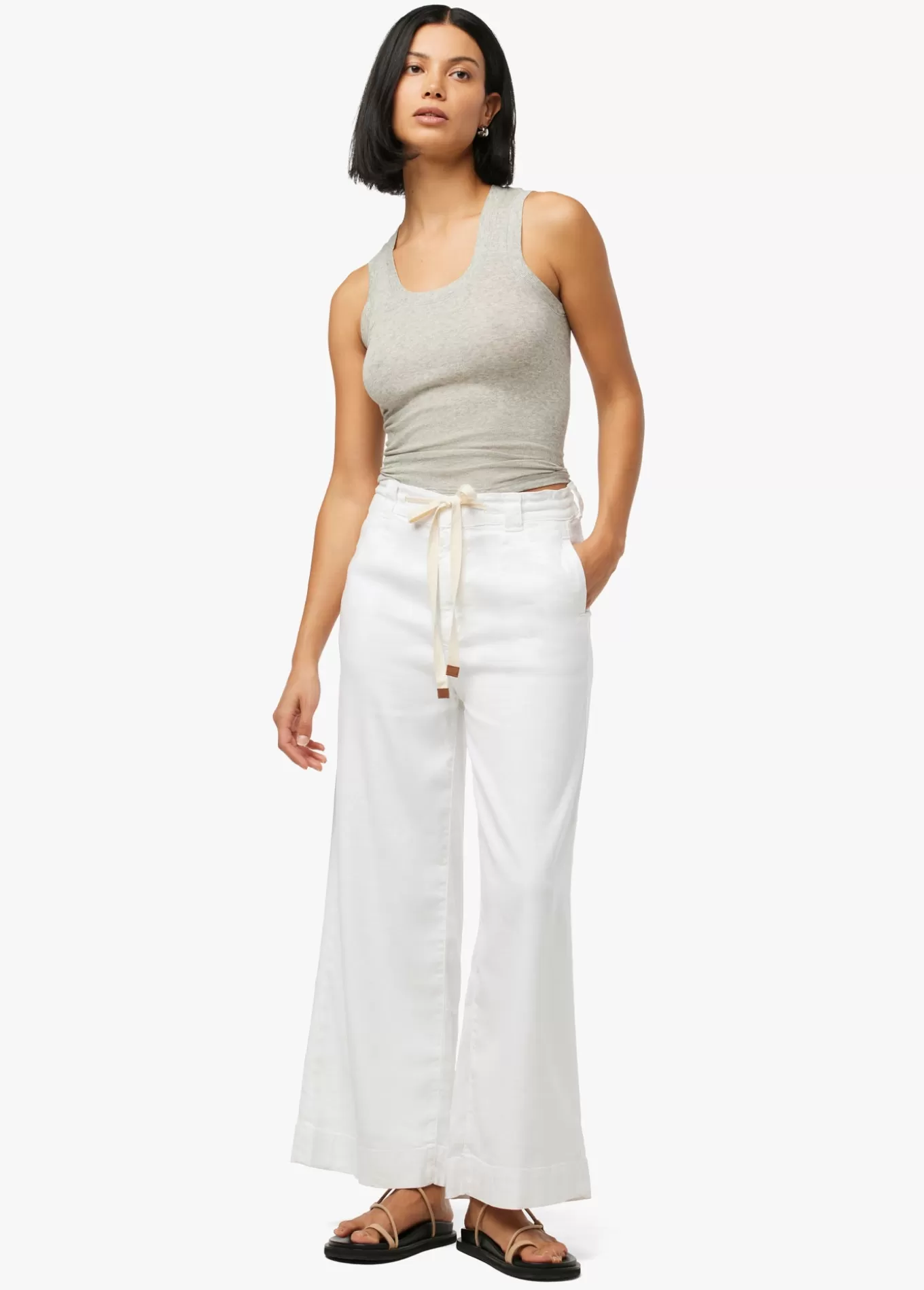 The ankle-length Addison Pant is ready for all your favorite footwear. The pallazo cut is styled with a wide leg, drawcord waist and seam pockets. The lightweight fabric has just enough stretch making it the perfect spring wardrobe addition in White. Rise: 11.5;Inseam: 27;55% Linen, 44% Lyocell, 1% ElastaneModel is wea
