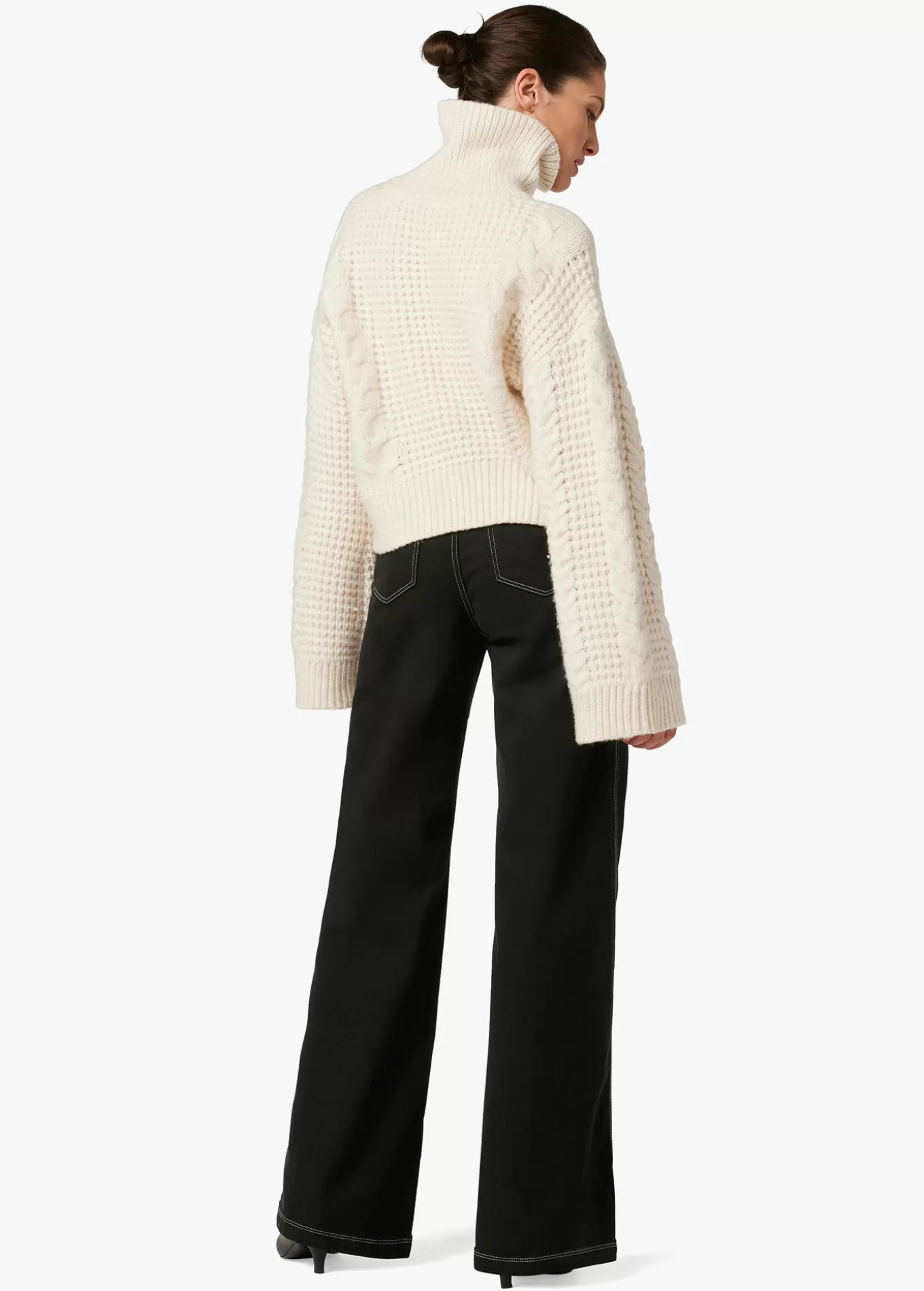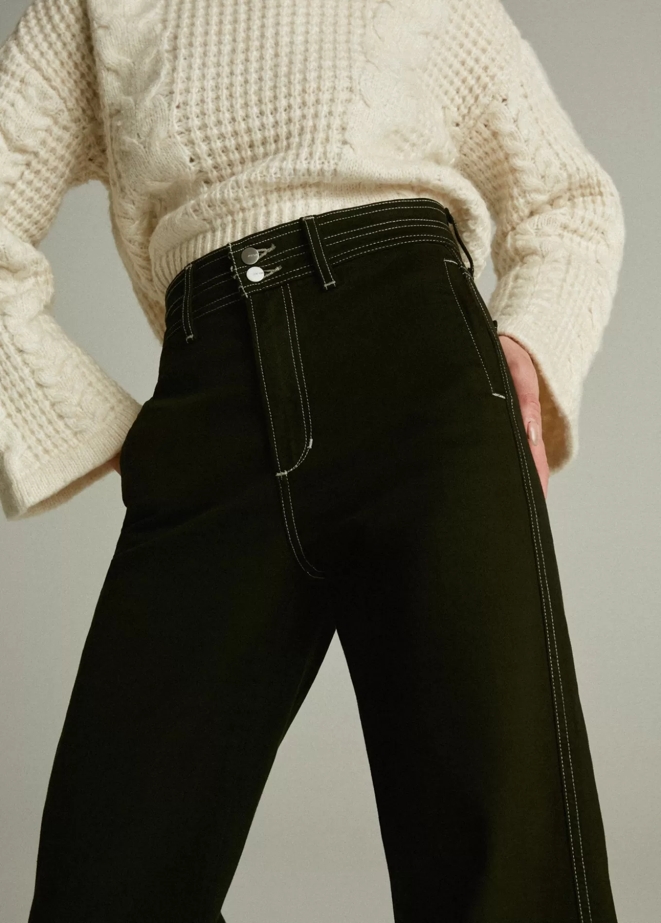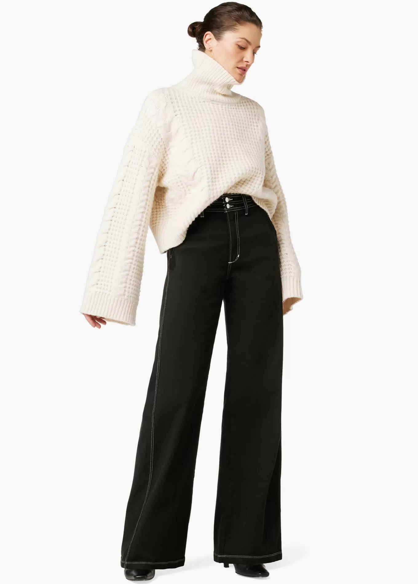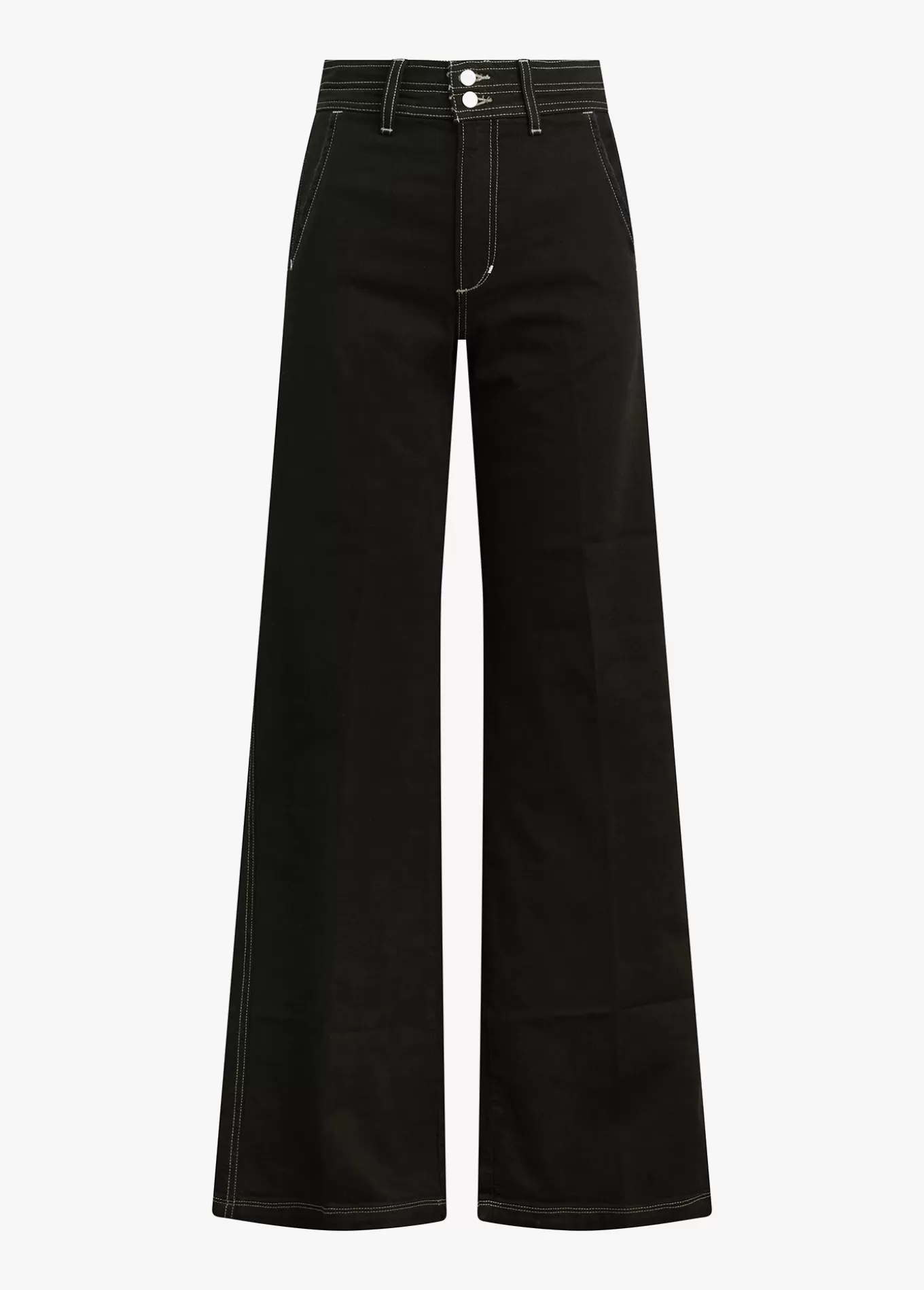 The high-rise, wide leg Allana Jean in Black has just enough stretch to hold its shape. It's an of-the-moment look with slant front pockets, wide hem and double button waistband. 12; RISE32; INSEAM63% Cotton, 35% Lyocell, 2% ElastaneMODEL IS WEARING SIZE 26 12; front rise 15 3/4; back rise 22 3/4; leg opening 32; insea