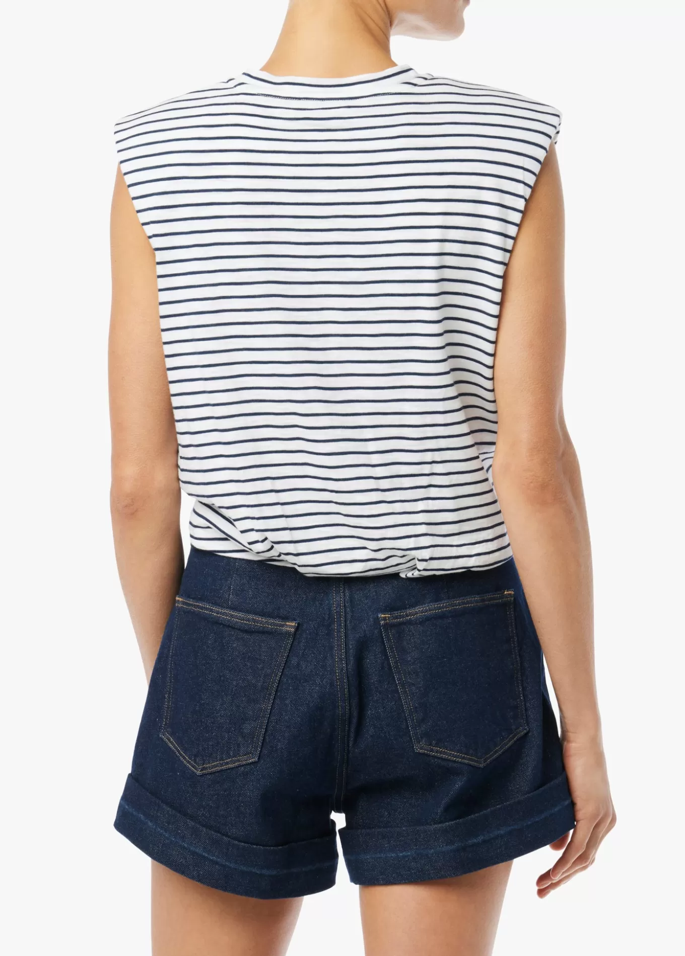 This sleveless tee is the perfect throw-on for warmer weather. With pronounced shoulder structure, a bubble hem and stri…