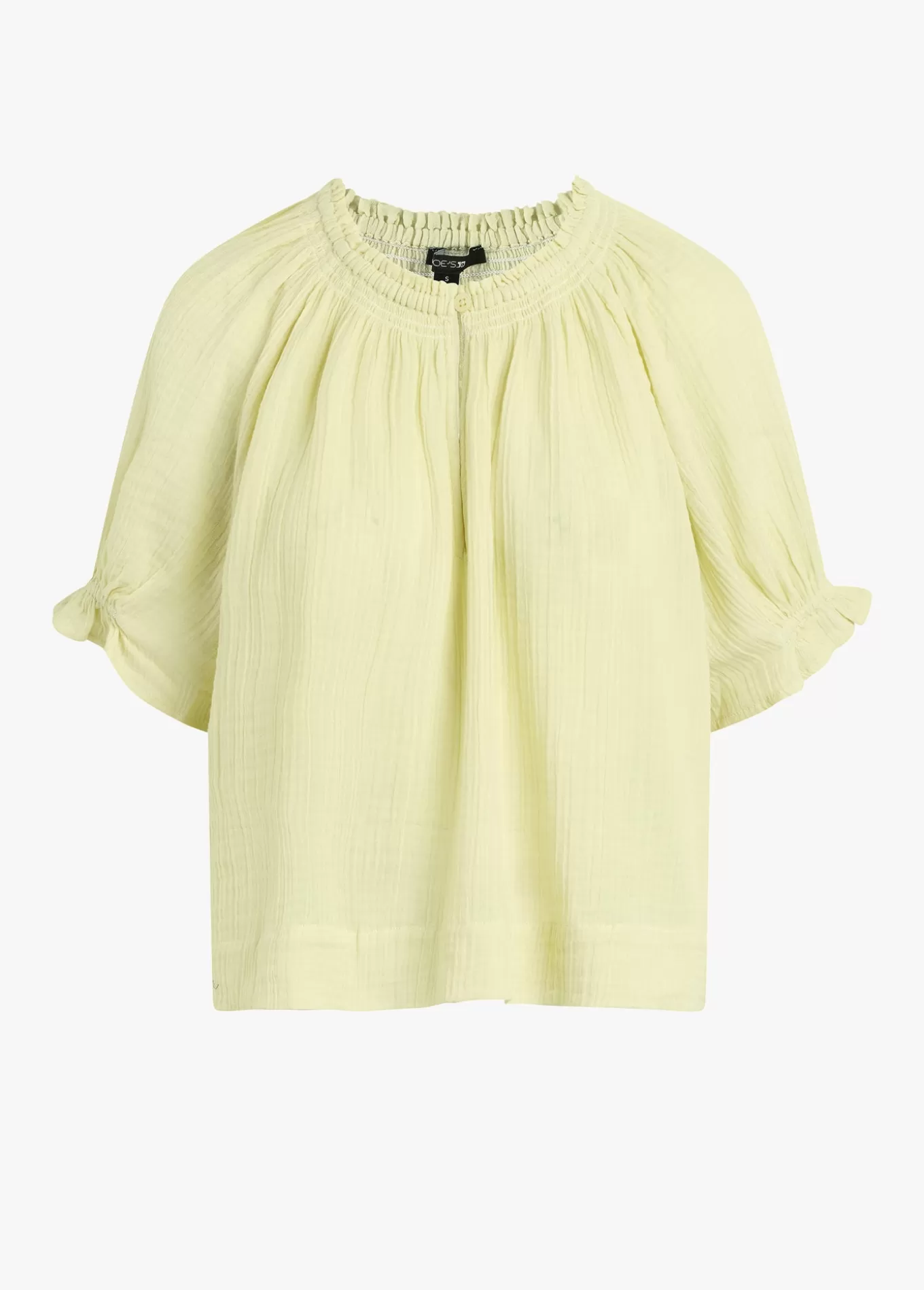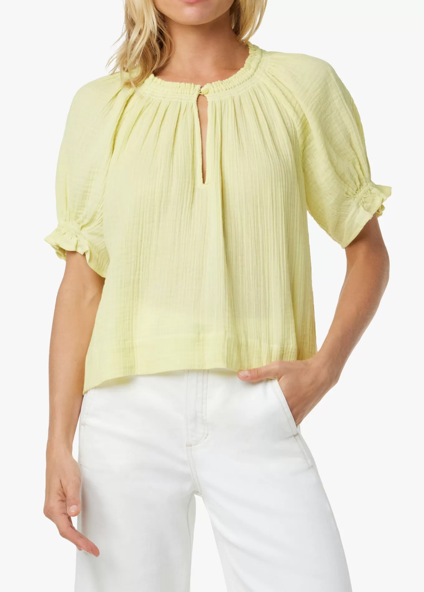 Puff sleeves, shirring detailing, and drapey gauze fabric bring The Bonnie Blouse to life. Cut in a cheerful, yellow cot…