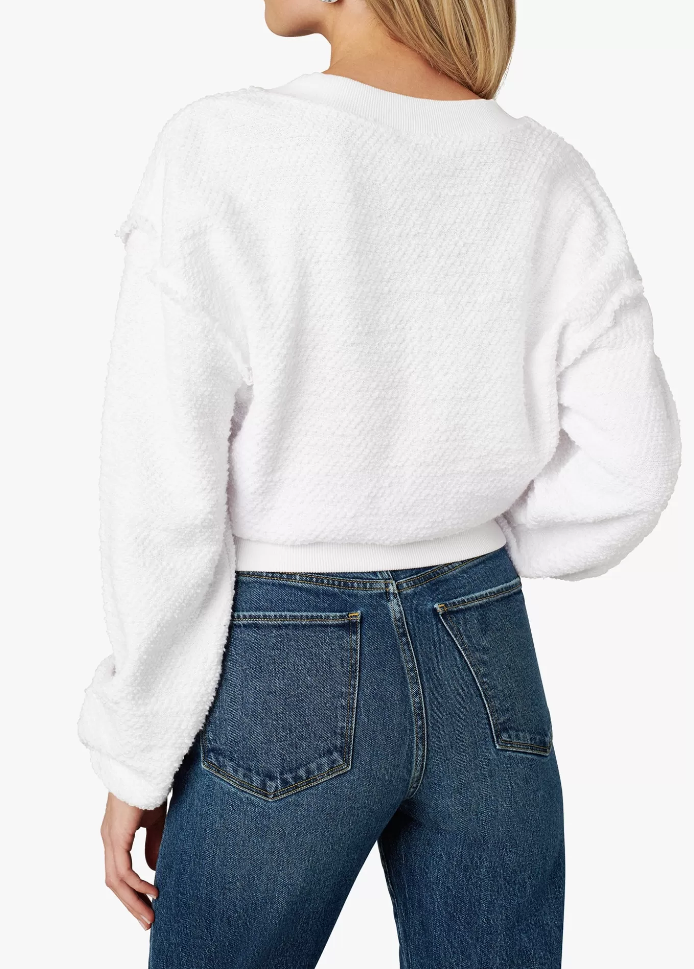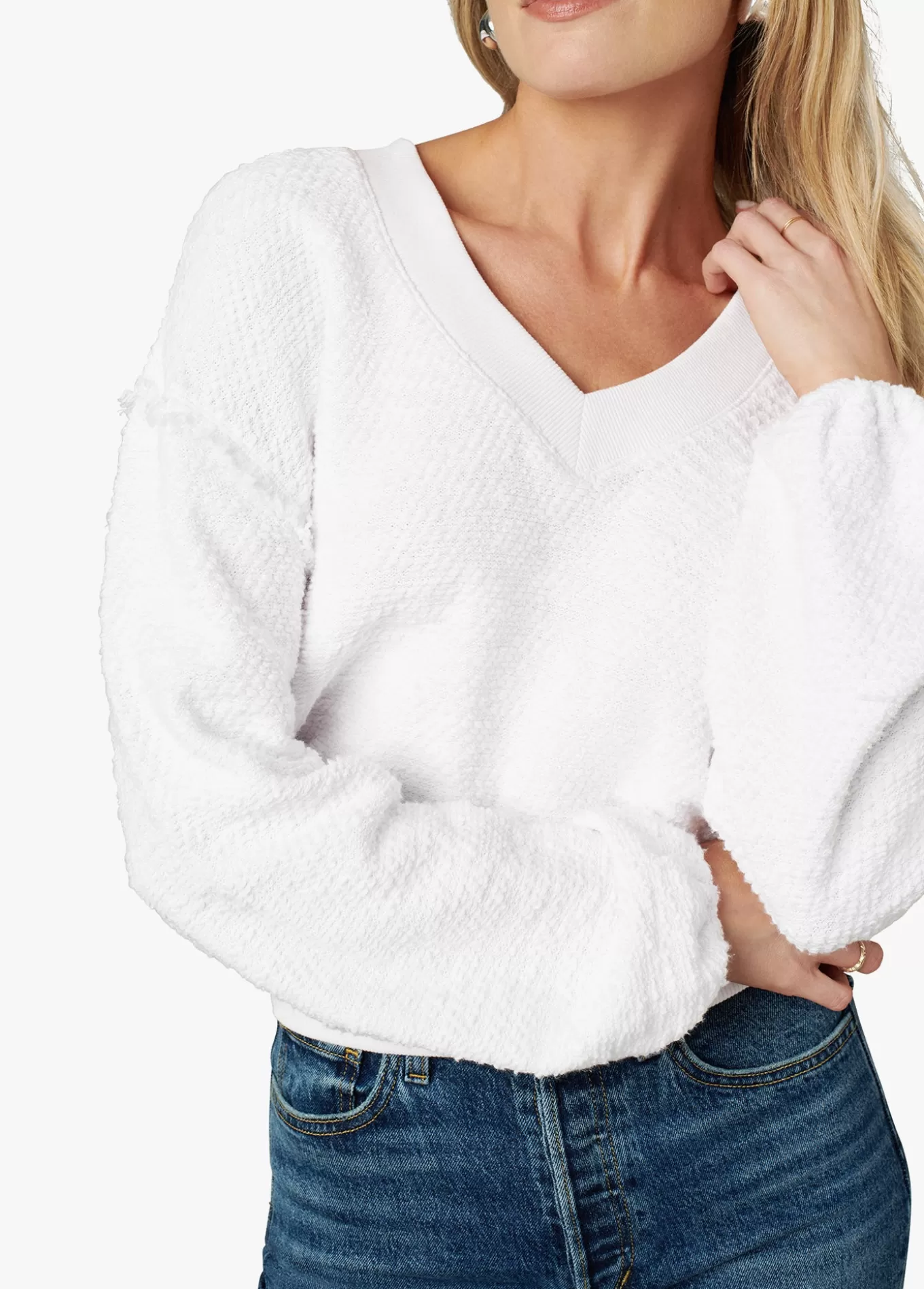 The Carolyn Slubby Deep-V Sweatshirt is the most cozy pullover that works for casual days and cool nights. It's done in Optic White, soft textured knit with a cinch-ribbed waist to flattter your frame, balloon sleeves, and a plunging neckline.100% CottonModel is wearing size small