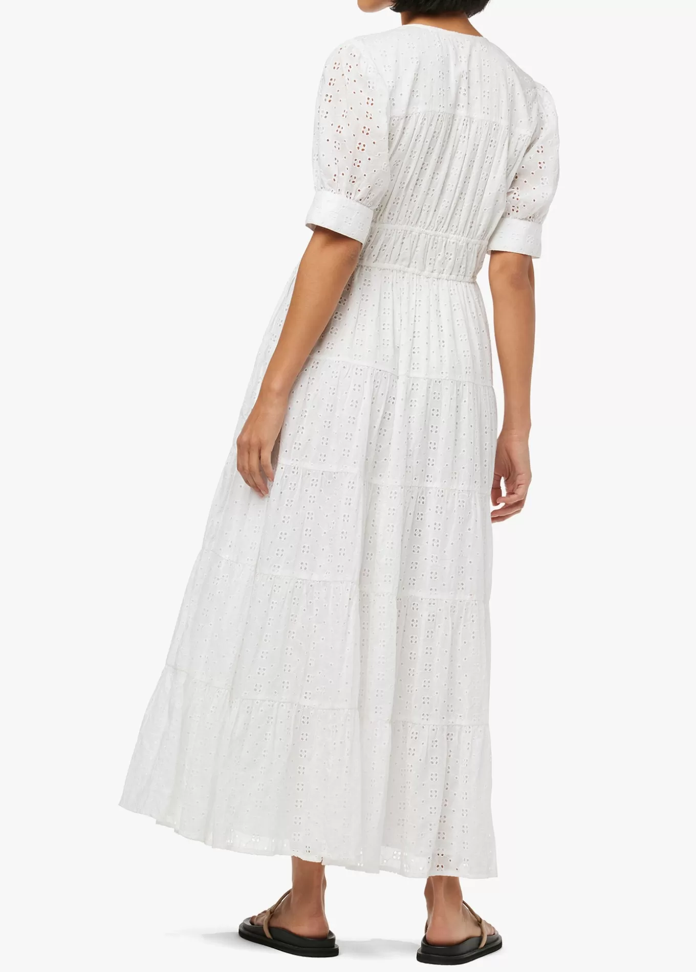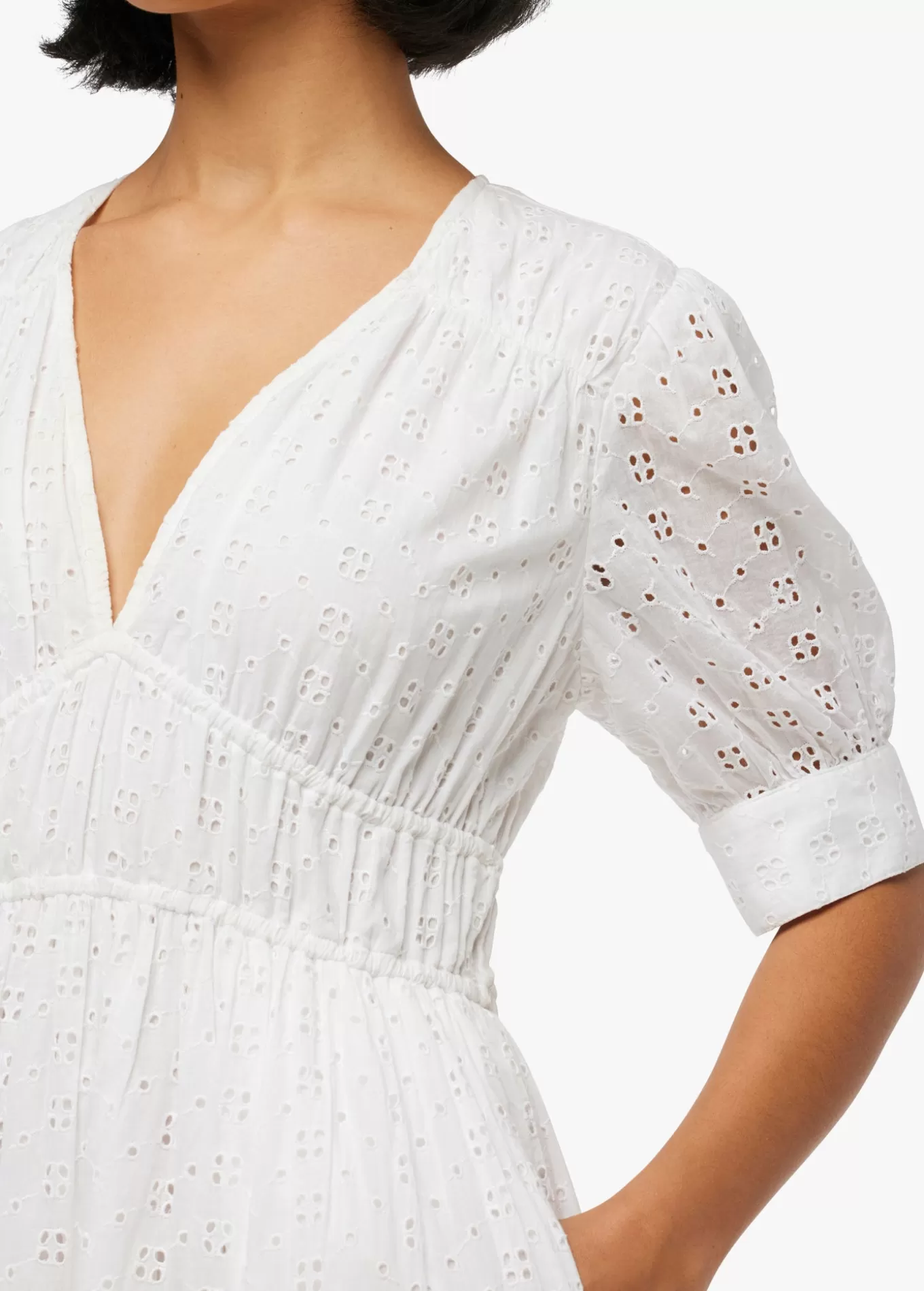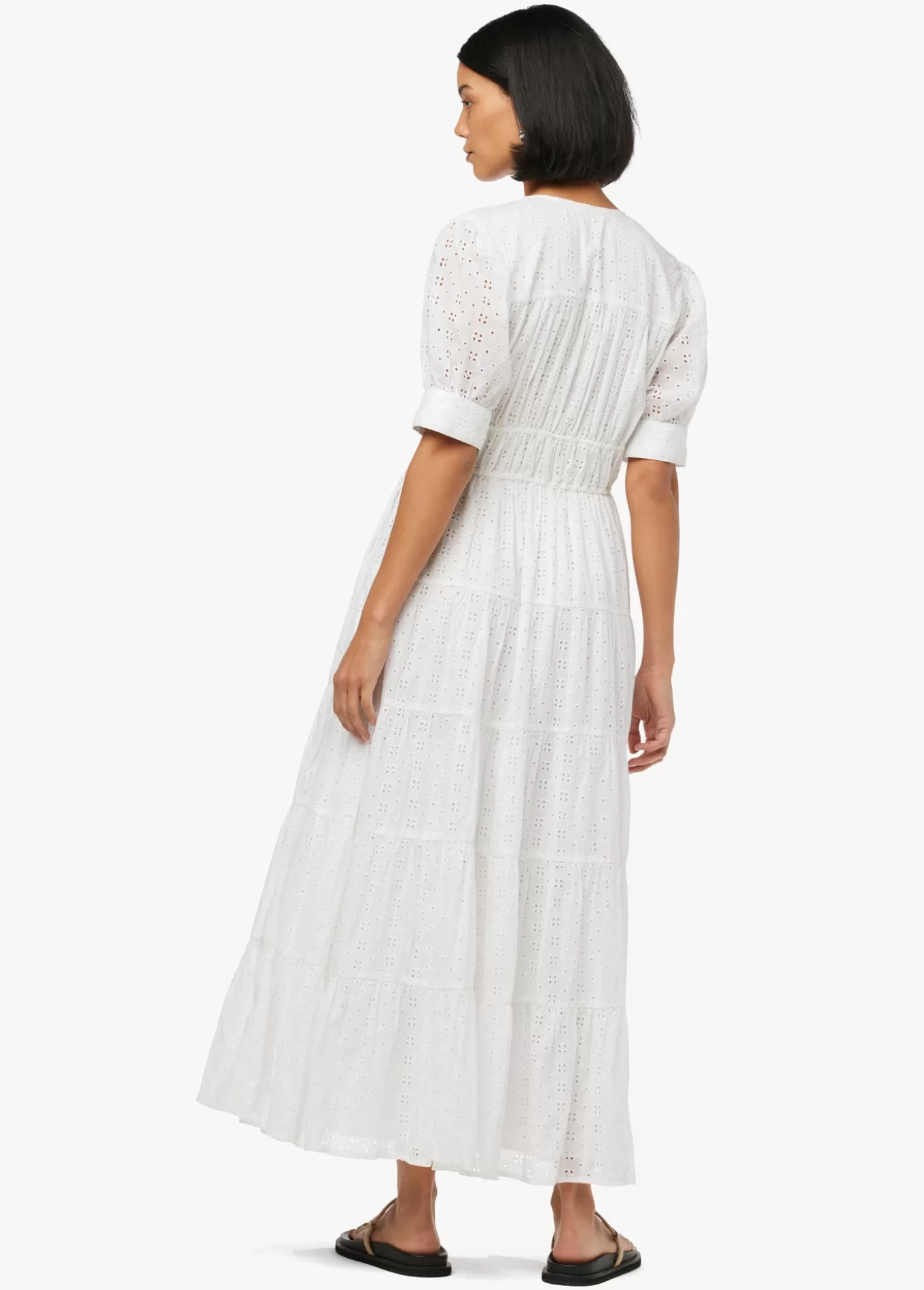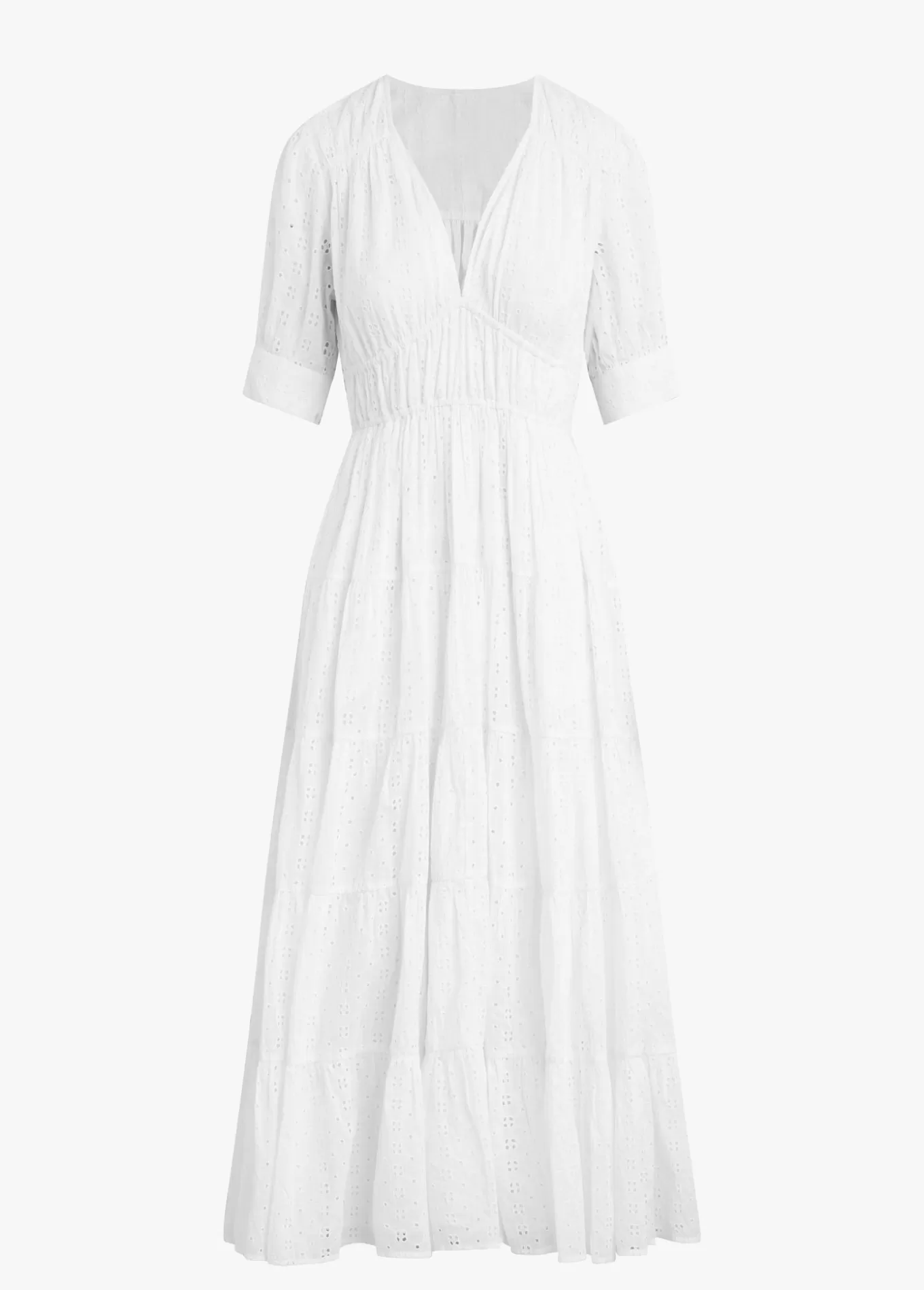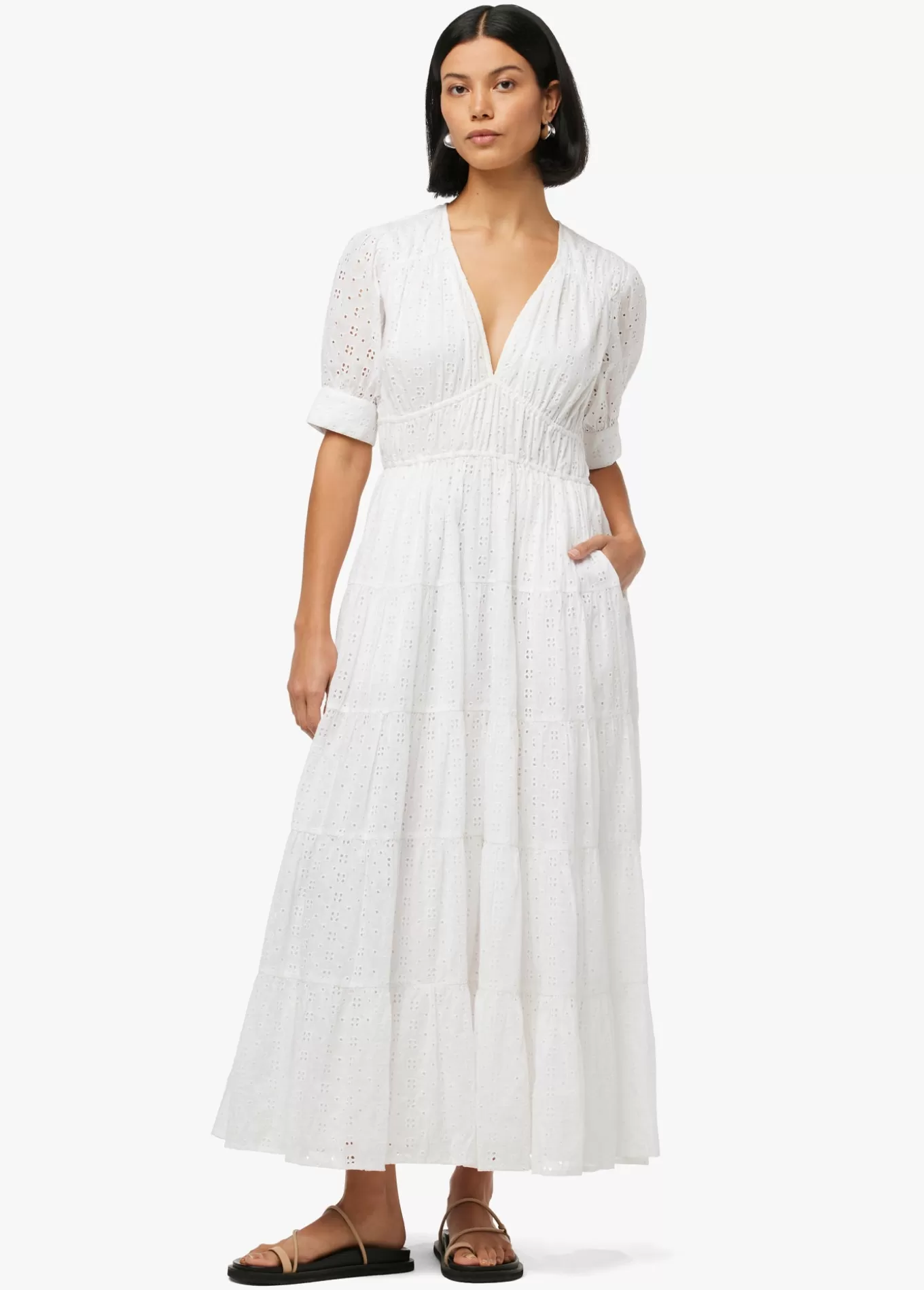 The Illana broderie dress is a maxi with flowy easy silhouette that perfect for spring. featuring soft gathered sleeves and feminine v-neckline the cut from crisp white organic cotton part of our earth conscious collection. 100% Organic CottonModel is wearing size Small