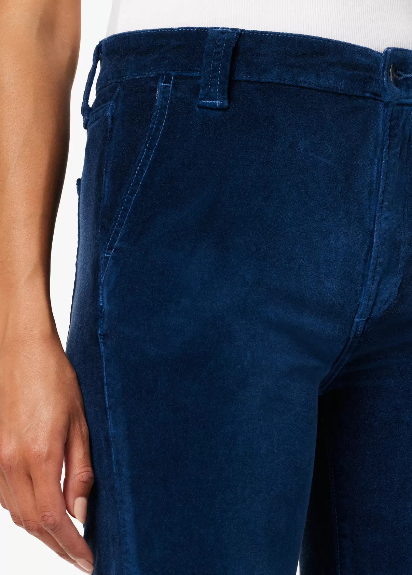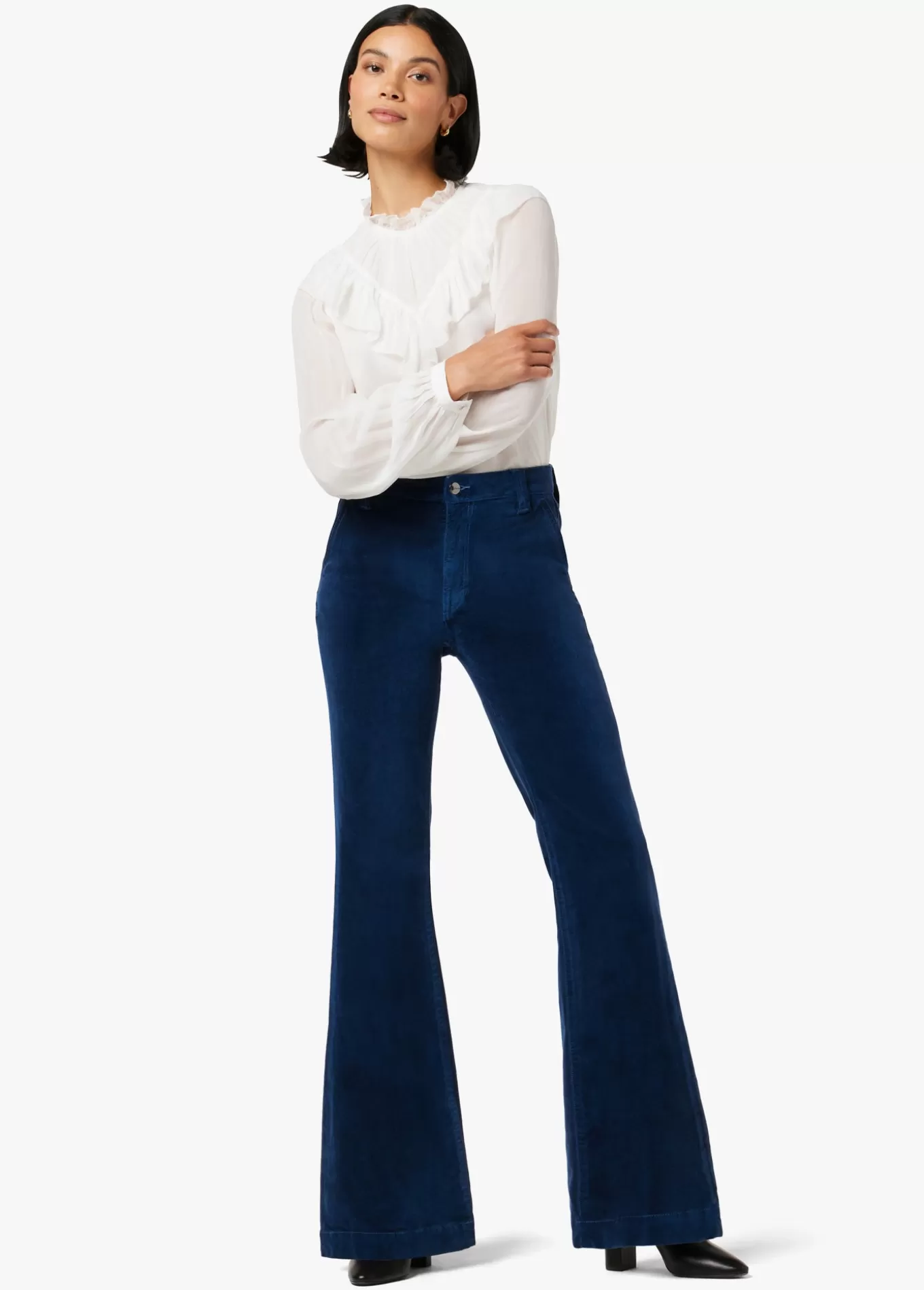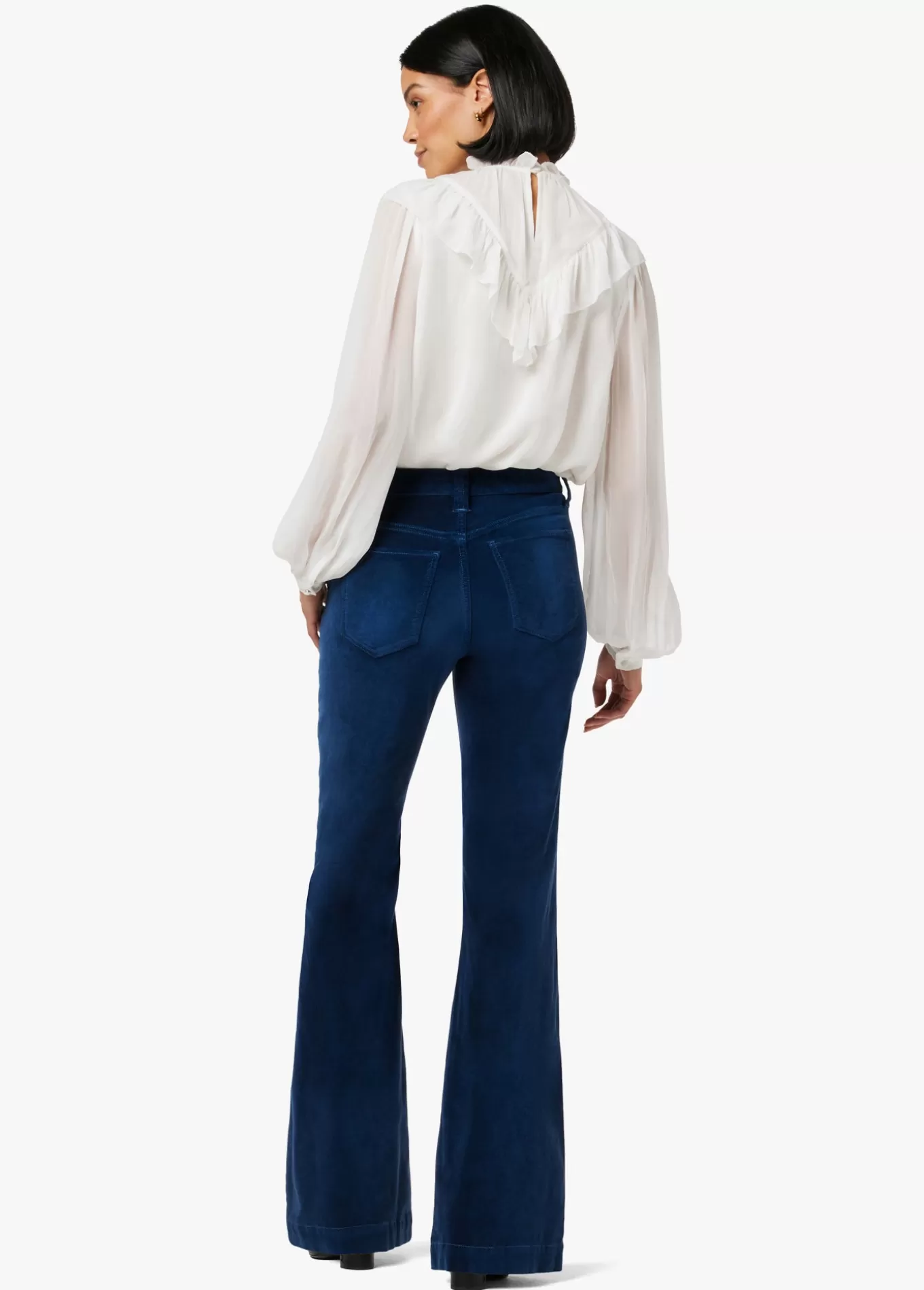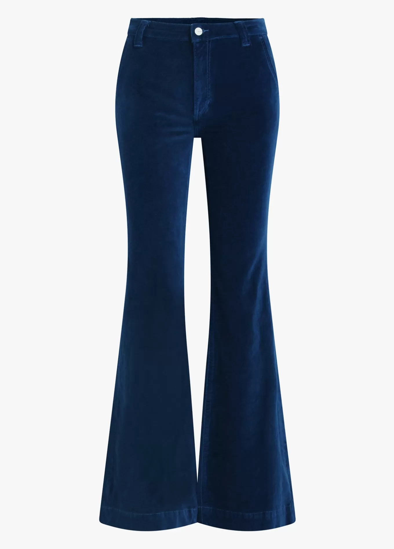 The Molly High-Rise Flare is fitted at the waist and kicked out at the wide hems, creating a curve-hugging ’70s-inspired silhouette. These forever flattering jeans feature stretch velveteen in a rich blue wash, Pageant Blue, and are complete with slant front pockets. 10.25; RISE34; INSEAM67% COTTON 31% VISCOSE 2% SPAND