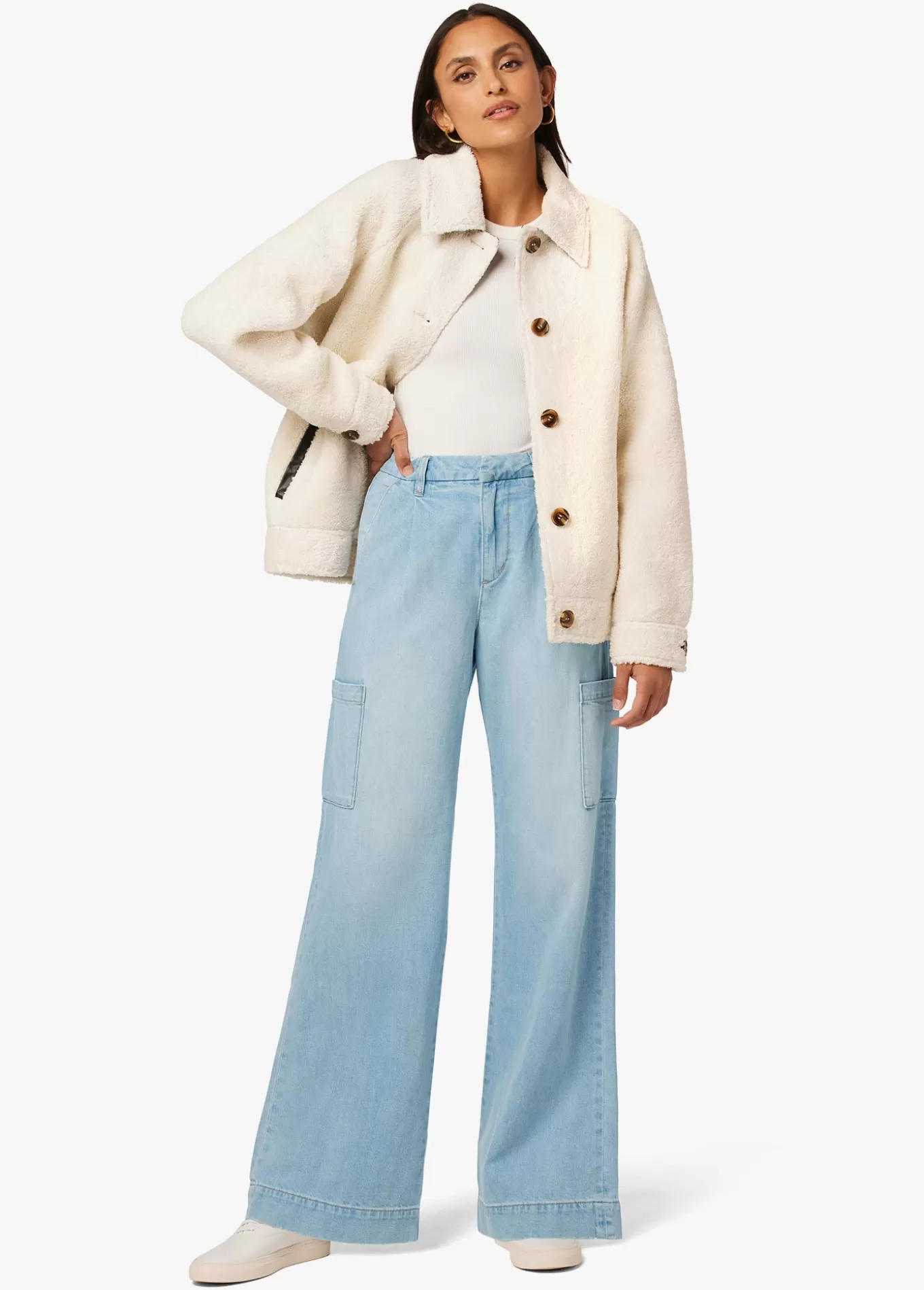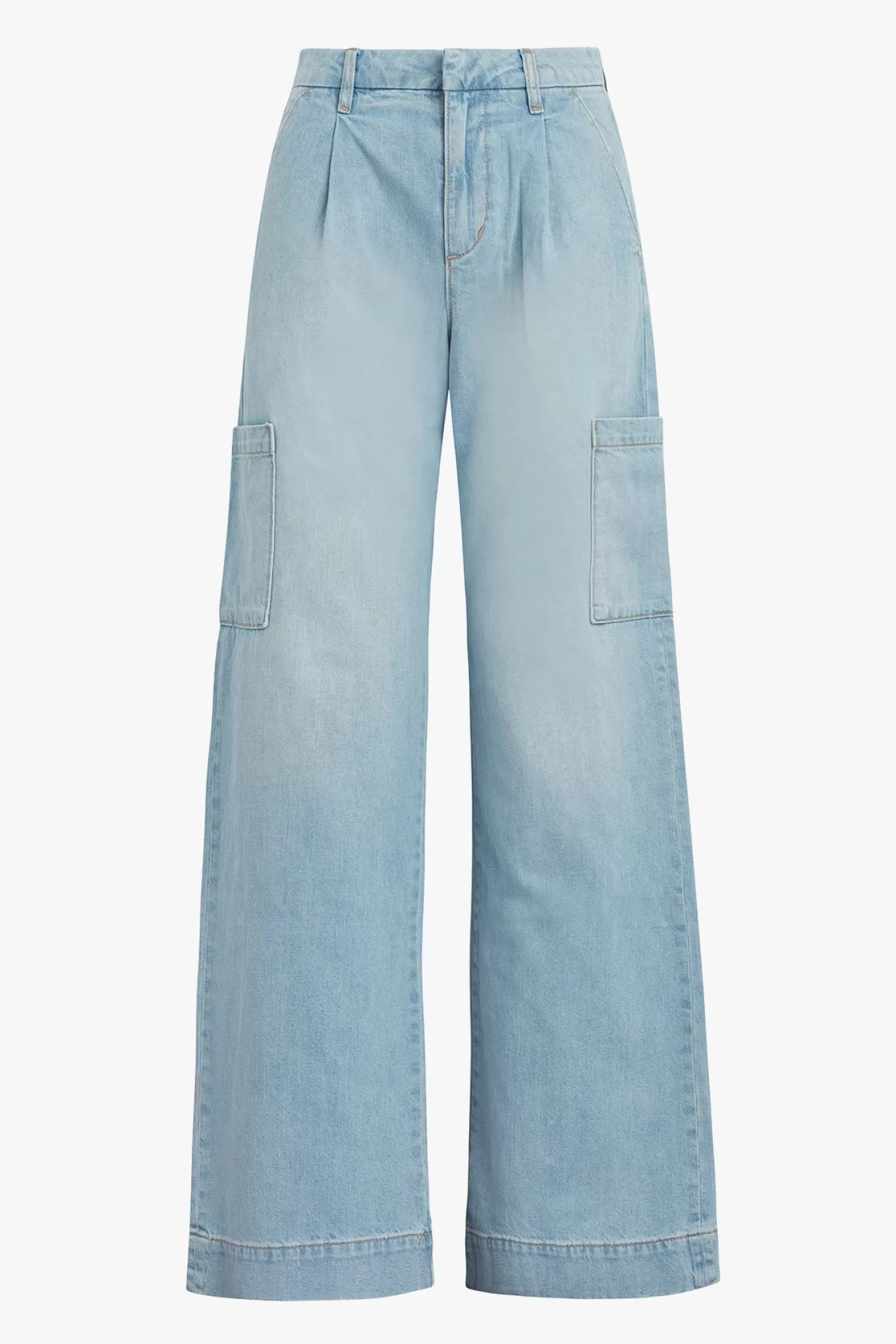 Classic cargos get a feminine revamp with The Petra. This effortlessly cool, wide leg pant has a high rise and wide hem with front pleats and trouser pockets. The light blue shade of 'Petra' is washed down and finished with a deep hem and cargo pockets.11 4/7; RISE33 1/2; INSEAM85% Cotton, 15% LinenMODEL IS WEARING SIZ
