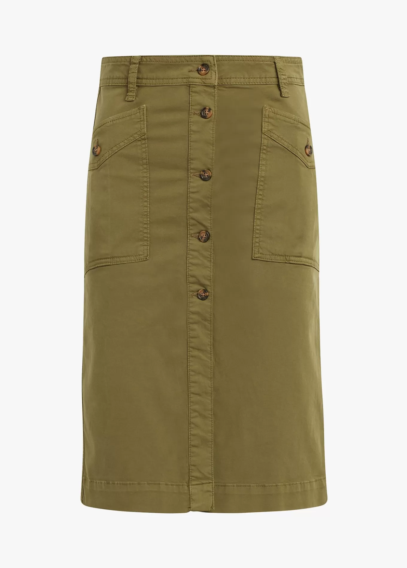 Cargos are having a moment and the Premium Cargo Skirt is here for it. The skirt is outfitted with button front and expertly-placed, oversized pockets that add character but keep the tailored shape. The Burnt Olive is a soft, earthy neutral that makes a great denim alternative. 27.75; INSEAM MODEL IS WEARING SIZE 26 27