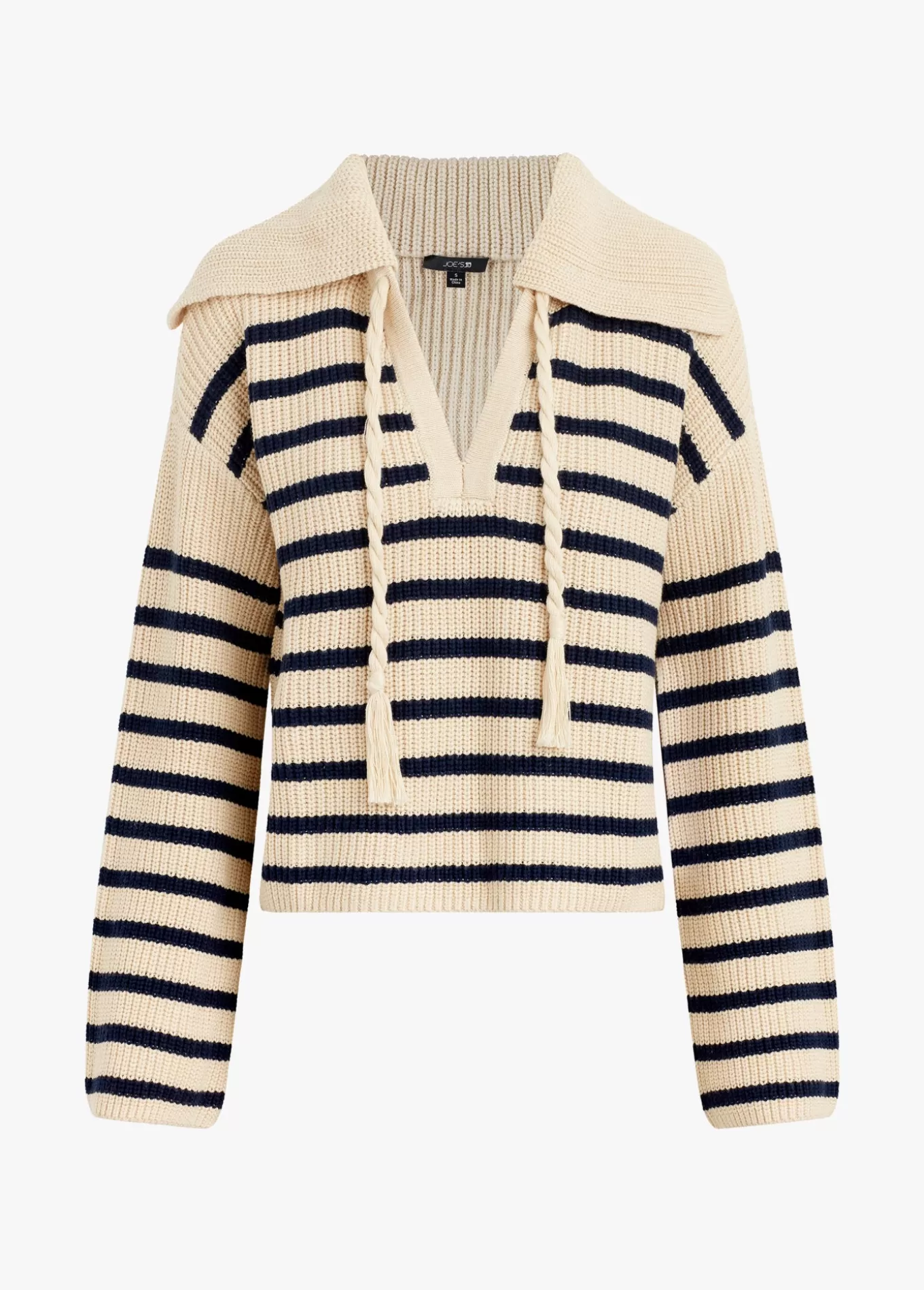 Introducing the Sloane Popover Sweater, a new twist on a classic stripe sweater. With a flattering v-neck, braided detai…